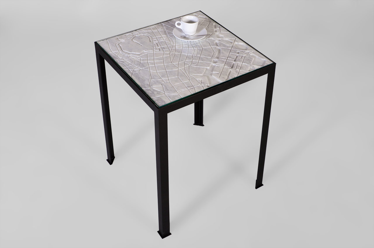 La collection « City » s'inspire des plans et tracés des plus grandes villes du monde. Le marbre met ainsi en valeur les principaux axes des villes grâce à sa texture et ses contrastes. Le marbre gravé est protégé par une plaque de verre qui s'adapte parfaitement au piétement d'acier en toute légèreté. Plusieurs types de villes montrent l'évolution de la structure urbaine. « Tokyo » est l'alliance parfaite entre l'ancien et le moderne. Partant de l'ancien centre de la mégalopole, formé autour du château et de ses douves, la nouvelle ville, plus organisée et aux tracés perpendiculaires, s'étend peu à peu sur la mer au rythme de ses agrandissements successifs.
